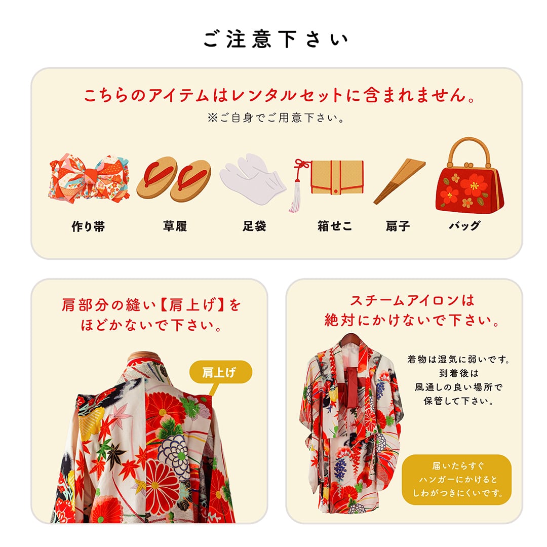※帯・草履・足袋・扇子・はこせこ・バッグ・イヤリングはセットに含まれません。